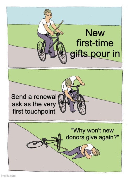 Build at least one non-ask touchpoint into your new donor journey. A welcome email with a survey, a casual video, or even a plain-text thank you from someone other than your executive director.