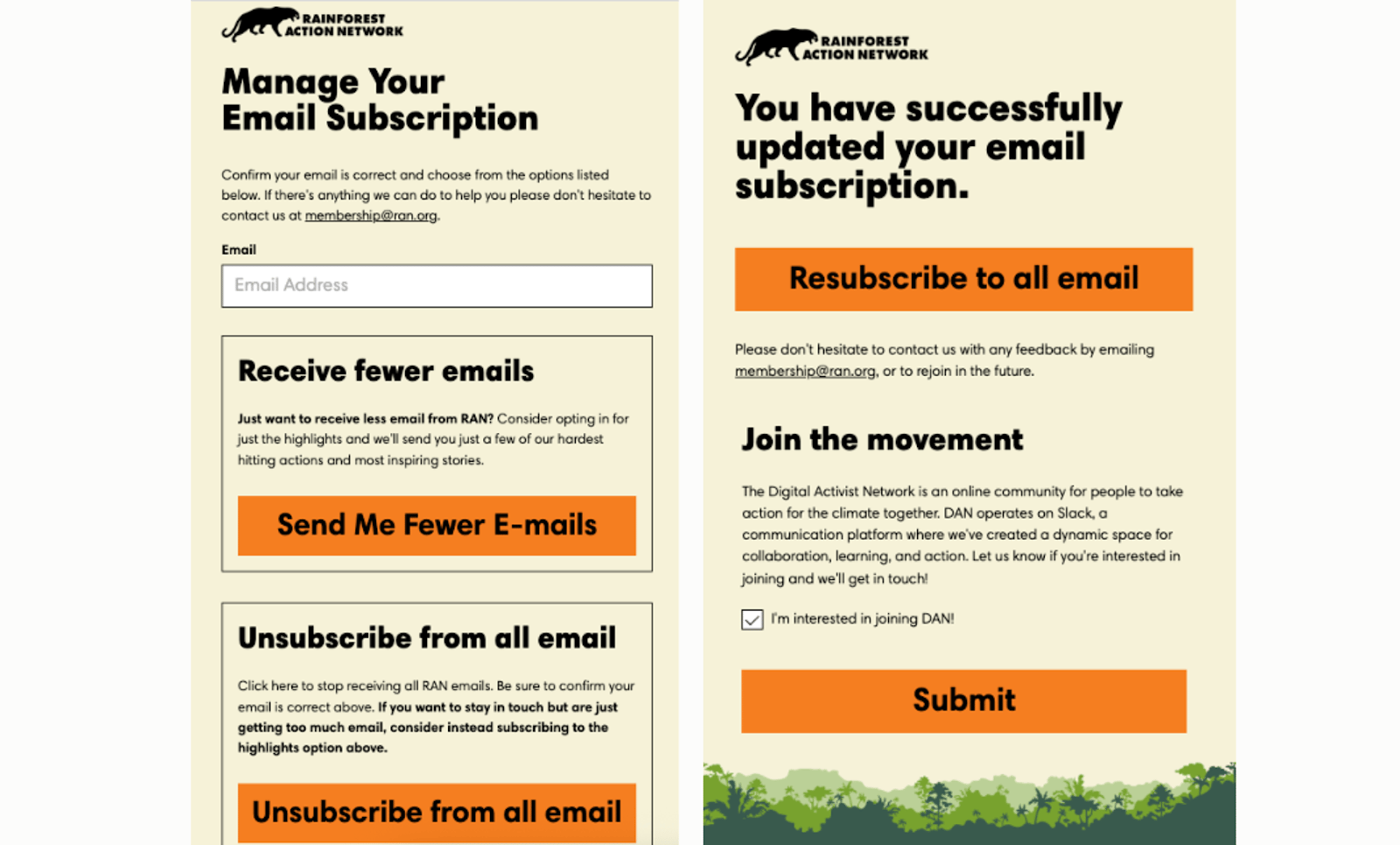 Rainforest Action Network (RAN) was guilty of that. Their old unsubscribe setup was a binary: you’re in, or you’re out.